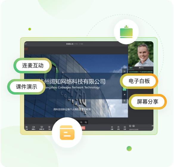 • 電子白板、多人連線、屏幕共享、在線答題,為企業提供更省錢、更流暢的教學直播能力。